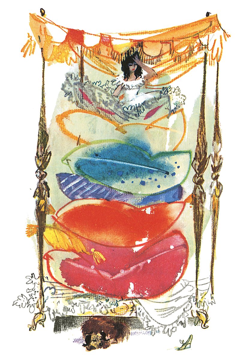 «Ну, уж это мы узнаем!» – подумала старая королева, но не сказала ни слова и пошла в спальню. Там она сняла с постели все тюфяки и подушки и положила на доски горошину; поверх горошины постлала двадцать тюфяков, а ещё сверху двадцать пуховиков.