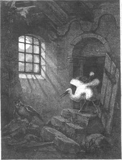 Она вместе с аистами покинула комнату, чтобы вести их в ту Залу. Они долго шли в темном коридоре; наконец из-за полуразвалившейся стены им блеснул в глаза яркий свет.