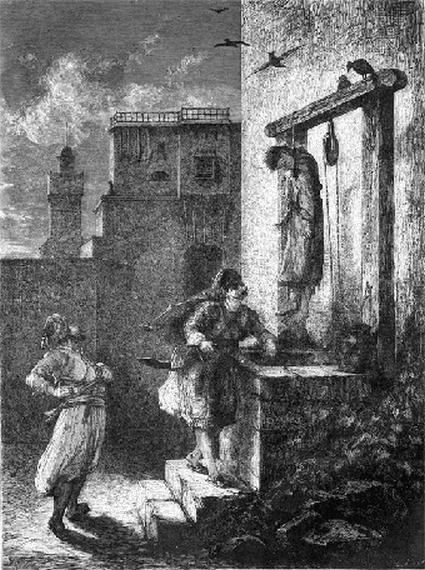 Когда они спускались в водопровод, Орбазан и один из разбойников взяли карлика и вывели его на двор; здесь они обвязали вокруг его шеи шелковый шнурок, взятый ими для этого с собой, и повесили его на самом высоком шпице фонтана. Наказав так измену несчастного, они сами тоже спустились в водопровод и последовали за Мустафой. Обе девушки со слезами благодарили своего великодушного спасителя Орбазана, а он торопил их, так как было очень вероятно, что Тиули велит преследовать их во все стороны.