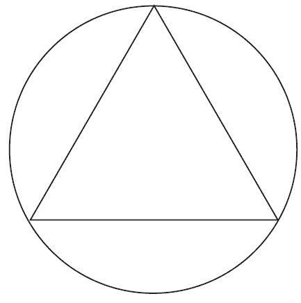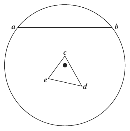 Так как ошибка, о которой здесь идет речь, все же еще очень распространена, – необходимо здесь же указать на ее источник, хотя обстоятельное исследование может быть сделано только впоследствии. Мы заранее высказываем следующее положение: при смешении двух цветов можно получить все цветовые тона, находящиеся между ними. Располагая по Ньютону цвета в круге, мы получаем из смеси каких бы то ни было двух цветов b (рис. 1) – все цветовые тона цветов, находящиеся между а и b. При дополнении цветового круга всеми смесями цветов с белым, находящимся в центре круга, – таким образом, что из чистых цветов, помещенных по окружности, на каждом соответствующем радиусе, мы получаем все смеси с белым цветом – прямая аb представляет все смеси цветов а и b. Очевидно, что смешанные цвета не так чисты как цвета их составляющие, потому что в результате смешения одновременно возникает и белый цвет и тем в большем количестве, чем больше а удалено от b. Рассматривая представленную на рис. 1 геометрическую фигуру, можно прийти к заключению, что каждая группа трех цветов с, d, е, которые так расположены, что образованный ими треугольник включает в себя центр, могут дать все смеси цветов, соответствующих по цветовому тону всей окружности. Это объясняется тем, что какой бы радиус мы ни взяли, он должен, идя от окружности к центру, пересечь одну из этих трех линий смешения цветов. В то же время видно, что число три есть минимальное количество цветов, при помощи которых можно этого достигнуть, так как два цвета дадут только одну линию, которая случайно может и проходить через центр, но никак не образует поверхности, которая бы окружала его. На этом зиждется тот факт, что посредством удачно подобранных трех цветов можно получить все цветовые тона, но никоим образом не все цвета вообще. Даже в самом удачном случае, когда все три цвета находятся на окружности, на равном друг от друга расстоянии и являются, следовательно, «чистыми» цветами (рис. 2), даже в этом случае из всей поверхности круга, содержащей в себе все возможные цвета, возникающие из смешения спектральных цветов[1], наш треугольник смешения цветов покрывает лишь 2/5 площади, остальные же возможные смеси цветов, лежащие вне этого треугольника, – посредством смешения данных трех цветов получены быть не могут[2].