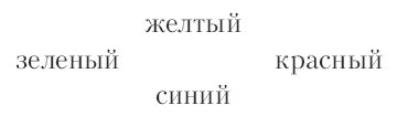 Тут необходимо, в первую очередь, возвратиться от физического анализа к психофизическому. Этим важным шагом мы и обязаны физиологу Эвальду Герингу. Его задачей было изучение цветов не спектра, а тех цветов, которые глаз воспринимает в ежедневном обиходе. Он расположил их не по длине волн, а только по непосредственным ощущениям сходства и противоположности. Таким образом, он пришел к заключению, что существуют четыре первичных цвета, а именно: желтый, красный, синий и зеленый. Эти цвета попарно являются противоположными, и поэтому он располагает их крестообразно: