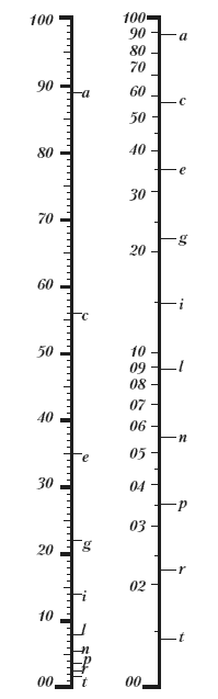 На рис. 4 левое деление представляет собою аналитическую гамму, разделенную на сто ступеней. Правое деление представляет собой точки acegilnprt практической шкалы серых цветов, расположенных соответственно содержанию в них белого цвета. Из рисунка видно, как велики расстояния ас и cl, как они быстро уменьшаются и в точках r и t так приближаются друг к другу, что становится невозможным нанести между ними еще какие-нибудь точки. Теоретически все-таки мы должны поместить между точкой t и конечной точкой еще бесконечное множество ступеней шкалы серого.