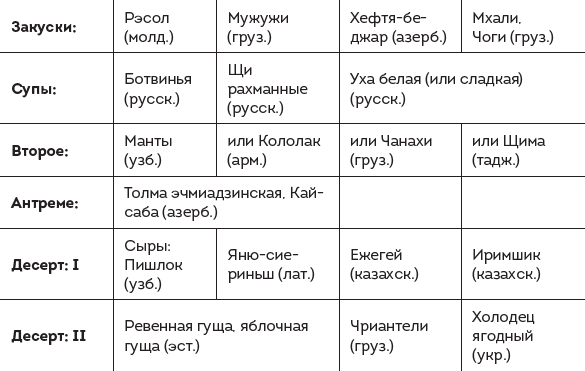 Мы приведем как пример одно такое правильное меню, оставив читателям возможность затем самим поупражняться в составлении «интернациональных обедов», пользуясь этой книгой.