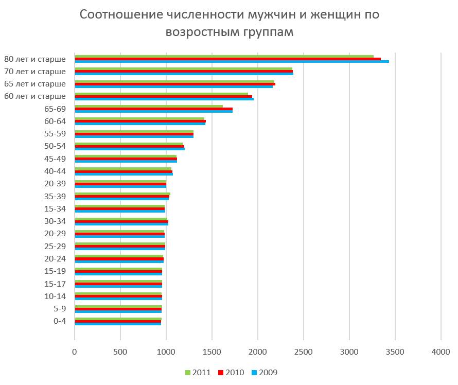 Ну, и как тебе эта гистограмма? Смотри. Видишь эти линии? Они показывают количество девушек на тысячу парней. До 24-х лет соотношение количества девушек на тысячу парней меньше тысячи. Это означает, что в этой возрастной группе (до 24-х лет) девушек меньше, чем парней. Примерно 900…950 девушек на 1000 парней. В возрасте до 34-х лет соотношение парней и девушек примерно одинаковое. По-настоящему заметная разница начинается только после 55 лет. Представляешь? Только после 55!!! Поэтому бойся потерять дедушку!!