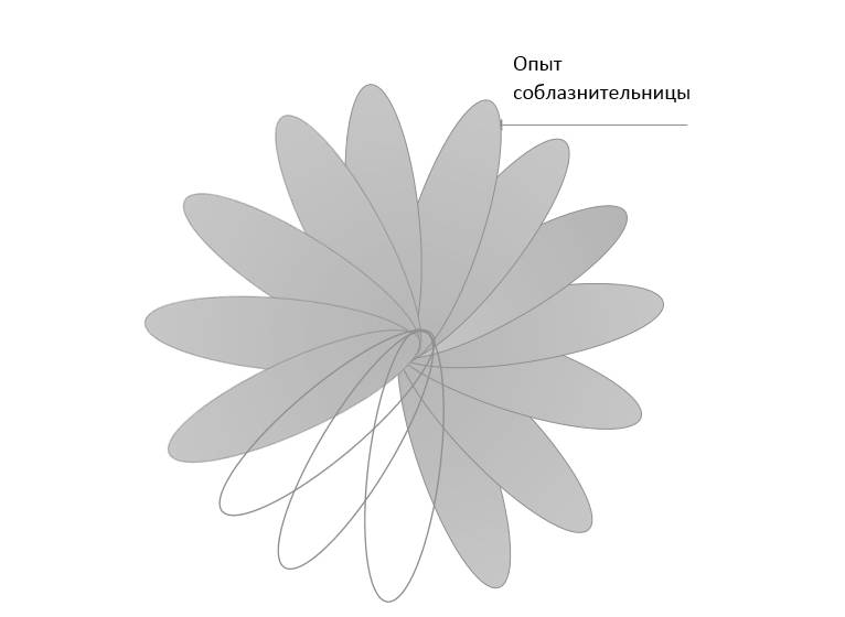 Видишь, встретившись с парнем, отображенным пустым эллипсом, обычная девушка понятия не будет иметь, как действовать. Соблазнительница стремится максимально заполнить круг опыта. Полностью заполнить этот круг нет возможности. К счастью, этого и не требуется. В моем случае круг опыта также не заполнен на 100%. А почему? А потому что мне нафиг не надо общаться со всеми гипотетически возможными типажами девушек, психологически больными, например, или просто неумными, с которыми скучно. Я общаюсь только с теми, с кем хочу. Если девушка хоть как-то мне не нравится, я не буду с ней общаться. Или я зря занимался этой темой и прокачивался? А еще почему? Всё тебе скажи…