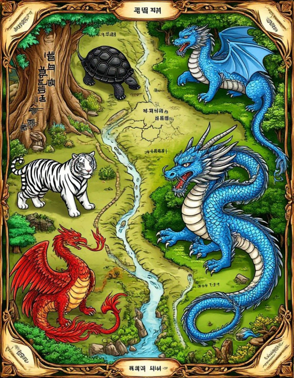 Древние корейцы из царства Когурё очень верили в этих Стражей. Когда они строили гробницы, то рисовали на стенах большие красивые картины – фрески. И всегда на восточной стене изображали Синего Дракона, парящего в облаках. На западной – Белого Тигра, на южной – Красного Феникса, а на северной – Черную Черепаху-Змею. Так они просили могущественных Стражей защитить покой своих предков со всех сторон света.