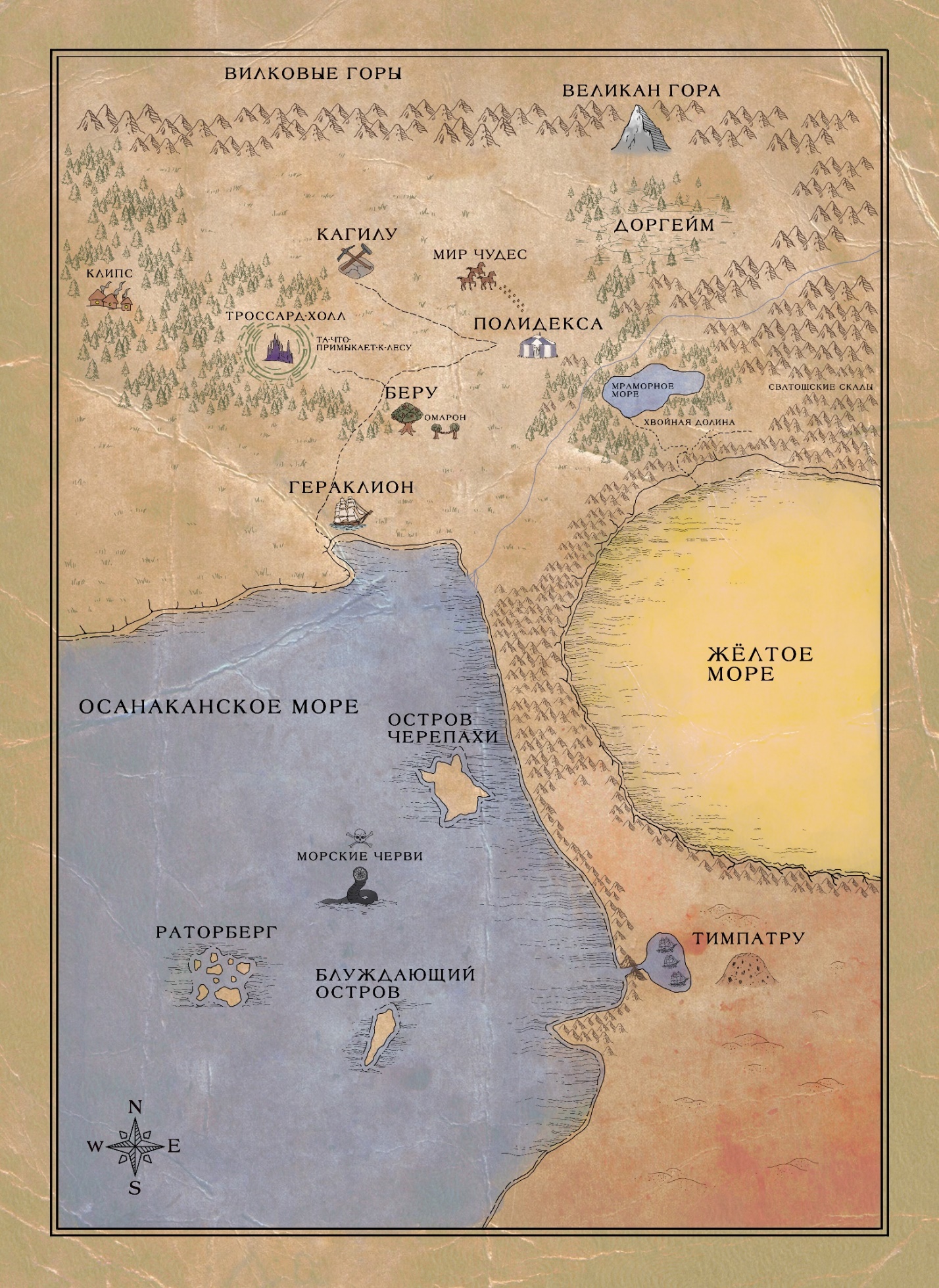 Он остановился на секунду передохнуть, в волнении созерцая это чудо природы. Тут было чему изумляться. Хоть Клипс и стоял у леса, но такого великолепия Артуру наблюдать еще не приходилось. Здешние деревья, казалось, были даже совсем не такого цвета, какого им полагается быть. Не зеленые, но какие-то синеватые, разлапистые, чудаковатые, как в сказке. А еще очень много сосен, можжевельников и елей. Бирюзовая листва с красным налетом от заходящего солнца трепетала под полузньским ветерком и словно бы даже издавала легкую волшебную трель, как серебряные колокольчики. И хоть Артур был еще далеко от леса, он уже различал эти манящие звуки, видел могучие стволы, с которыми могло бы сравниться разве что только беруанское древо по величию и красоте.