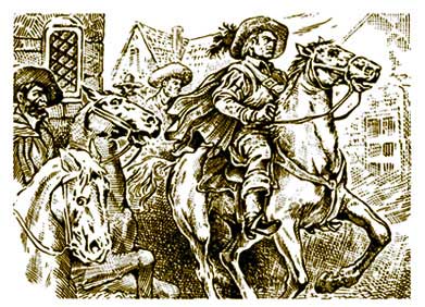 Верхом на великолепном, черном, как ночь, горячем коне, храня горделивую осанку, свойственную искусному наезднику, появился перед церковью святого Ипполита дон Энрике Руис де Мендилуэта в сопровождении пышного отряда всадников на вороных конях. Седло и уздечка дона Энрике сверкали золотом. И он, и сопровождавший его отряд всадников были одеты одинаково: фиолетовые панталоны и камзолы с белыми прорезями на рукавах, полусапожки оленьей кожи с золотыми шпорами, широкополые шляпы, украшенные белыми перьями, и парадная шпага на расшитой золотом портупее.