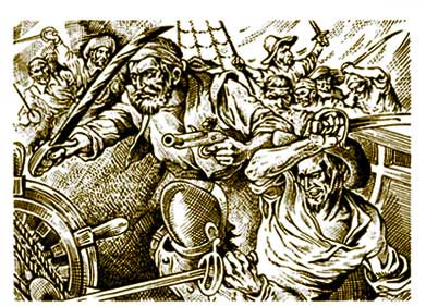 Старший из пиратов подал знак, ему бросили трап, и он решительно поднялся на борт. Капитан «Санта-Марии» вышел к нему навстречу.