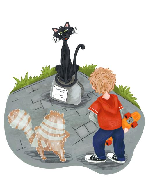 Друзья продолжили свой путь по набережной вдоль Преголи и вдруг услышали громкое шипение. Они огляделись и увидели справа скульптуру кошки на небольшом камне-постаменте.