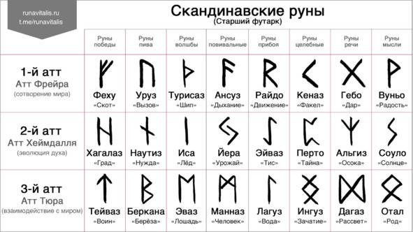 Старший футарк содержит 24 руны, разделённых на три ряда (три атта) по 8 символов. Каждый атт имеет свое название, связанное с одним из богов скандинавского пантеона.