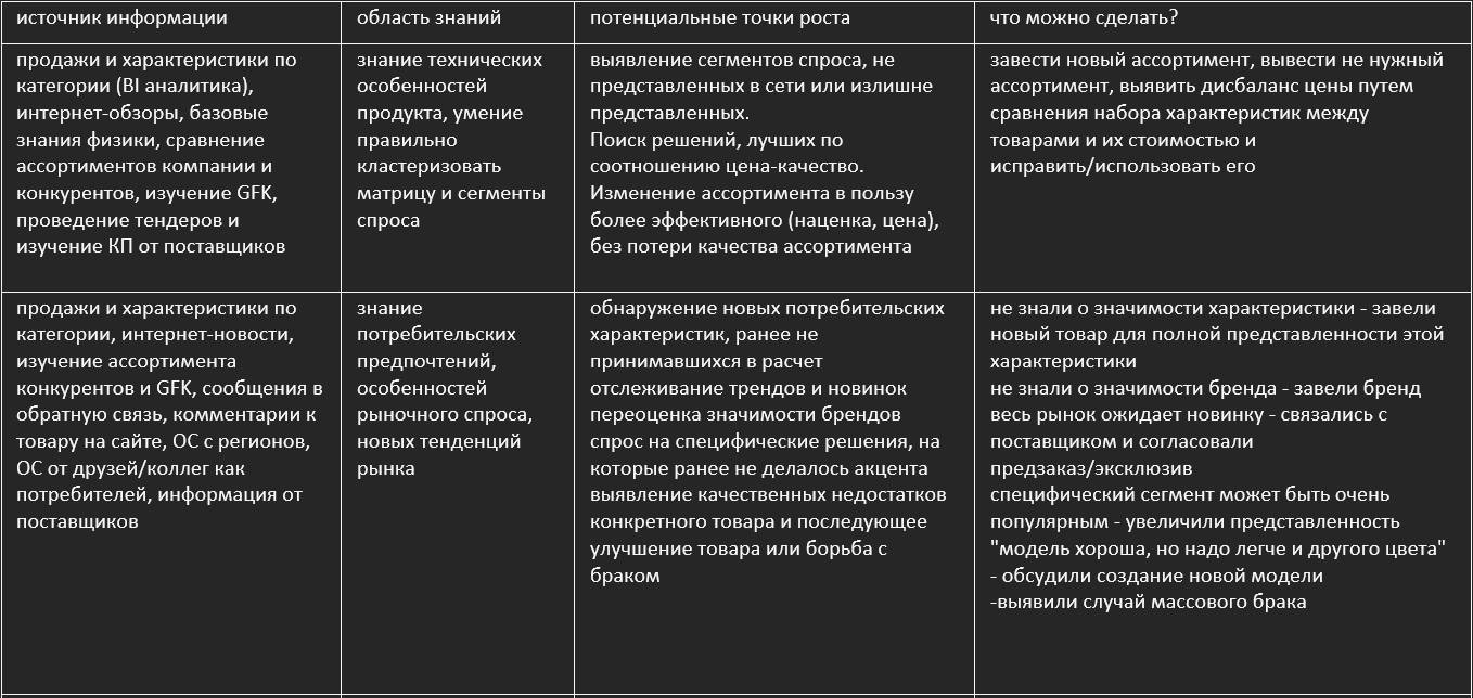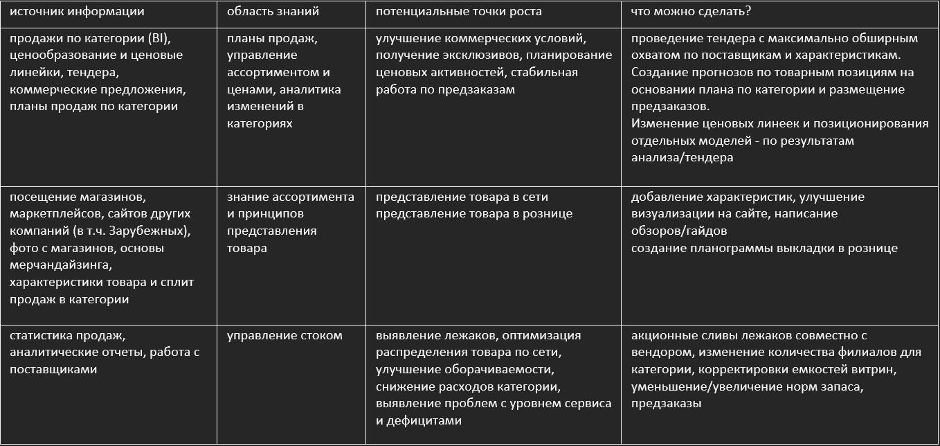 Такие упражнения помогают быстро разобраться в тонкостях конкретных категориях и определить важное/не важное для управления категорией.
