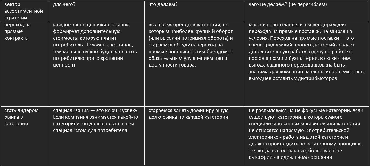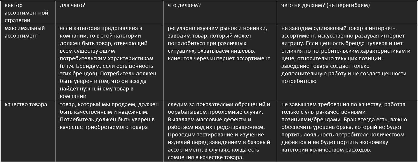По определению из учебника геометрии, вектор (в нашем случае – вектор ассортиментной политики) – это направленный отрезок прямой и направленность является его ключевой характеристикой. В разрезе правил ассортиментной стратегии мы должны руководствоваться этим направлением – двигаться в нужную сторону и не двигаться в противоположную. При этом, насколько далеко/быстро и обширно нужно двигаться в нужную сторону – каждый категорийный менеджер определяет для себя.