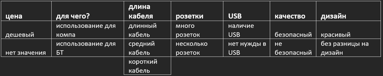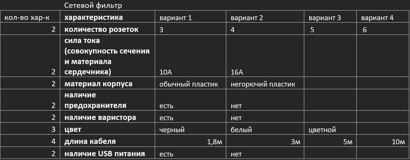 У нас есть изделие «сетевой фильтр». Определяем значимые для него потребительские характеристики, т.е. те, что влияют на выбор:
