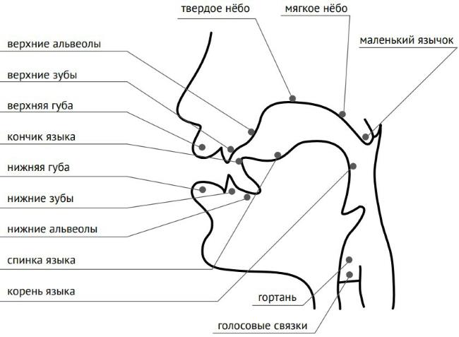 Артикуляционный аппарат состоит из органов ротовой полости: щек, губ, зубов, языка, нижней челюсти, нёба, глотки и гортани. Артикуляция – основа речи и пения.