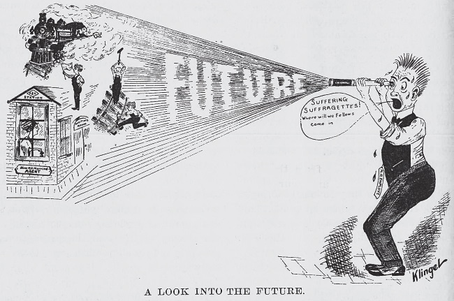 В апреле 1913 г. в одном из североамериканских железнодорожных журналов была помещена карикатура «Взгляд в будущее» (англ. «A Look into the Future»)[2], на которой работник железной дороги тревожно всматривался в волшебную подзорную трубу. Его беспокойство вызывалось открывшейся картиной: в недалеком будущем станционными агентами, сигналистами, стрелочниками и даже машинистами локомотивов стали женщины. «Куда нам идти?» – вопрошал работник, видимо, от имени всех коллег – мужчин. Безусловно, автор карикатуры гиперболизировал будущее американских железных дорог, заострив внимание читающей публики на злободневной «женской теме». И тем не менее сам факт появления подобного рисунка свидетельствовал не только и не столько об американской, сколько об общемировой тенденции постепенной интеграции женщин в сферу профессиональной железнодорожной деятельности на протяжении «долгого XIX века»[3] – в сферу, традиционно считавшуюся мужской.
