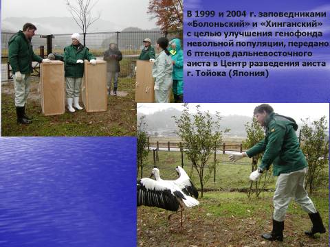 Принятию такого решения способствовало еще и то обстоятельство, что в сентябре 2001 года, в рамках Соглашения между администрацией Хабаровского края и префектурой Хего в области охраны окружающей среды, сохранения и изучения экологии и биологии в естественных условиях среды обитания дальневосточного аиста, мы принимали делегацию ученых из центра реинтродукции «Аистиный дом» (префектура Хего, Япония), и в Японии вопросами восстановления популяции занимались, почему-то, ученые-ветеринары.