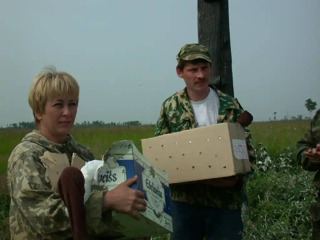 Птенцов надо уже в 10 утра доставить в Хабаровск, везти 430 километров машиной посчитали проблематичным. Решили использовать вертолет. Из Хабаровска раньше 10 часов вертолет вылететь не мог. С авиакомпанией РОСТА договорились, что вертолет ночует в Амурске, заповедник обеспечивает его охрану во время стоянки и проживание пилота с техником. На площадке авиакомпании РОСТА груз и сопровождающих будет ждать машина для доставки в международный аэропорт города Хабаровска. Охранять поставили двух инспекторов заповедника. Было это в выходной день, просто так стоять возле вертолета на диком пляже Амурска инспекторам было скучно, и они начали продавать за символическую плату билеты на полеты над Амурском на вертолете. Купилось на этот аттракцион невиданной щедрости два десятка отдыхающих на диком пляже. Потом ходили в заповедник за компенсацией целую неделю, а инспектора Блоха и Длинный вначале прятались от них, потом попросились на работу на территорию, зная суровый нрав местных жителей.