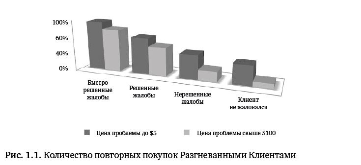 ● Цена, которую компания платит за некачественную работу с Разгневанным Клиентом, настолько высока, что может стоить ей жизни в прямом смысле слова. Согласно данным, полученным организацией TARP в результате исследования «Как много ваших разочарованных покупателей купят у вас снова»[1], в случае быстрого и исключительно позитивного подхода к решению проблемы Клиента вернутся за повторной покупкой 95 % из них. При этом из тех, кто ни на что не жаловался, обратно придут только 37 % Клиентов. Если же в результате возникшей проблемы «молчуны» потеряют значительную сумму, то таких у компании останется всего 9 % (рис. 1.1).