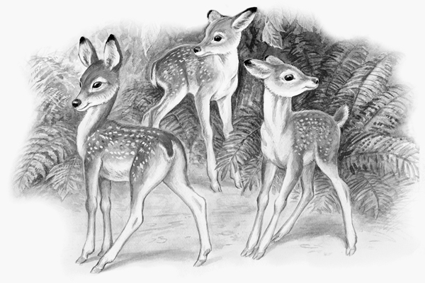 Видит: Оленуха в кустах со своими оленятами. И у Оленухи хвостик – маленький, пушистый, беленький хвостик. Муха как зажужжит: