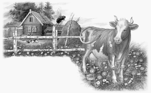 Вылетела Муха в окошко, села Корове на спину и давай жужжать, выспрашивать: