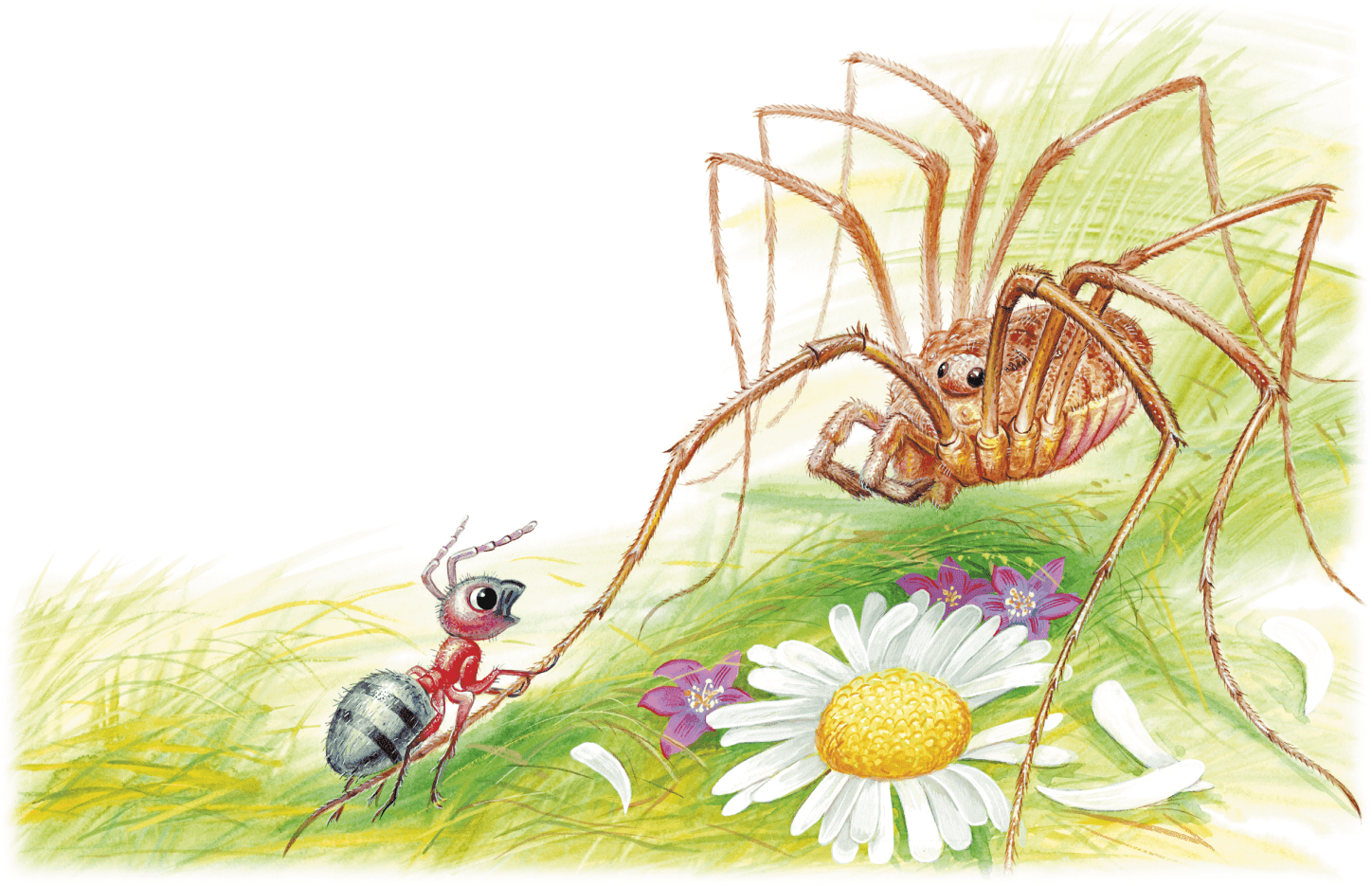 Остановился Землемер, вытянулся по земле. Муравьишка слез, еле отдышался. Огляделся, видит: луг впереди, на лугу трава скошенная лежит. А по лугу Паук-Сенокосец шагает: ноги как ходули, между ног голова качается.