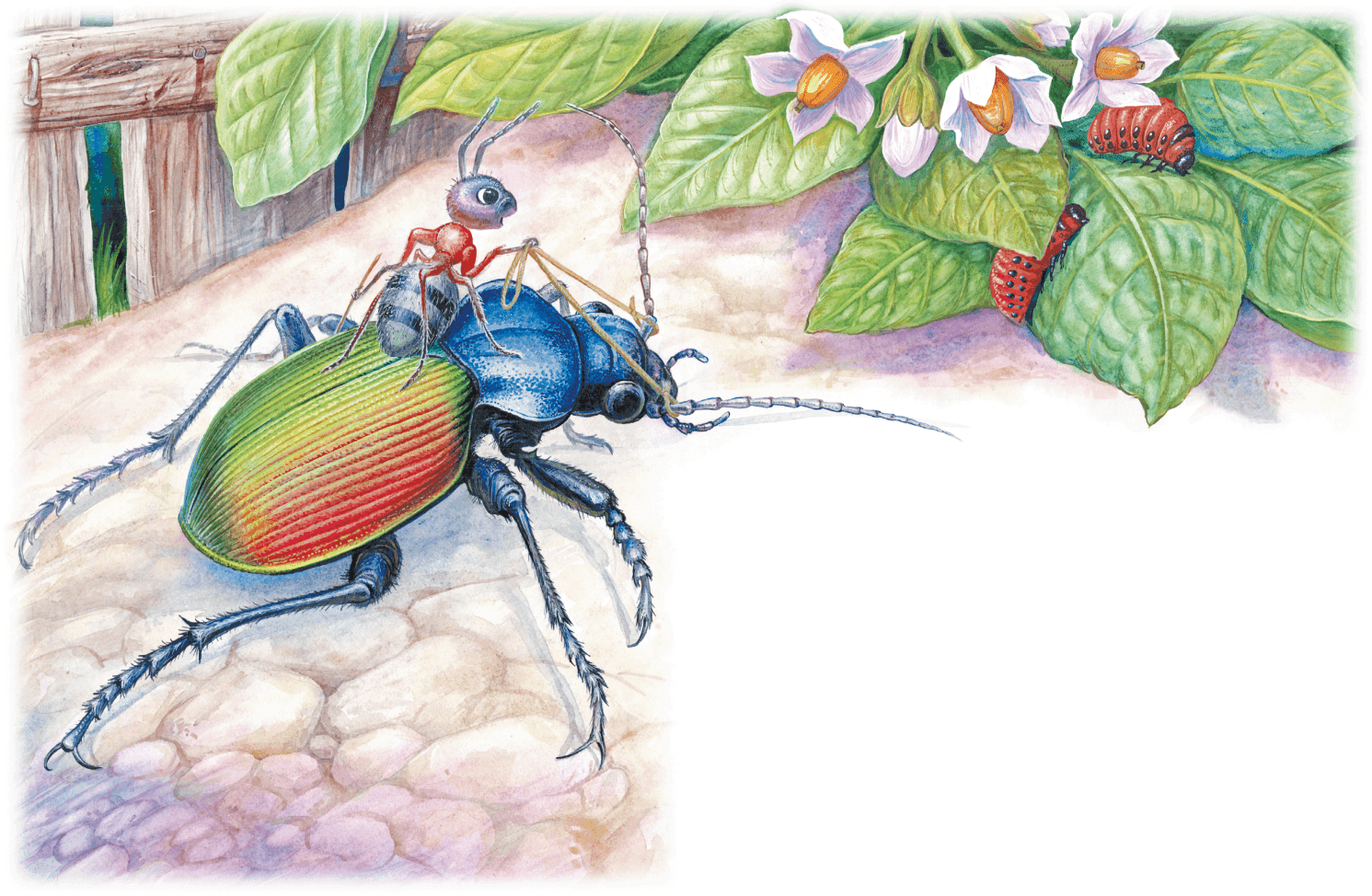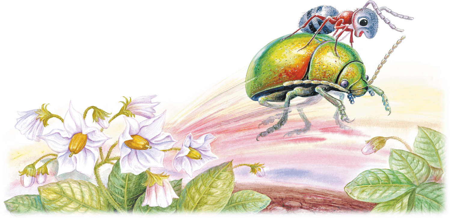 Только успел Муравьишка вскарабкаться Жужелице на спину, она как пустится бежать! Ноги у неё ровные, как у коня.