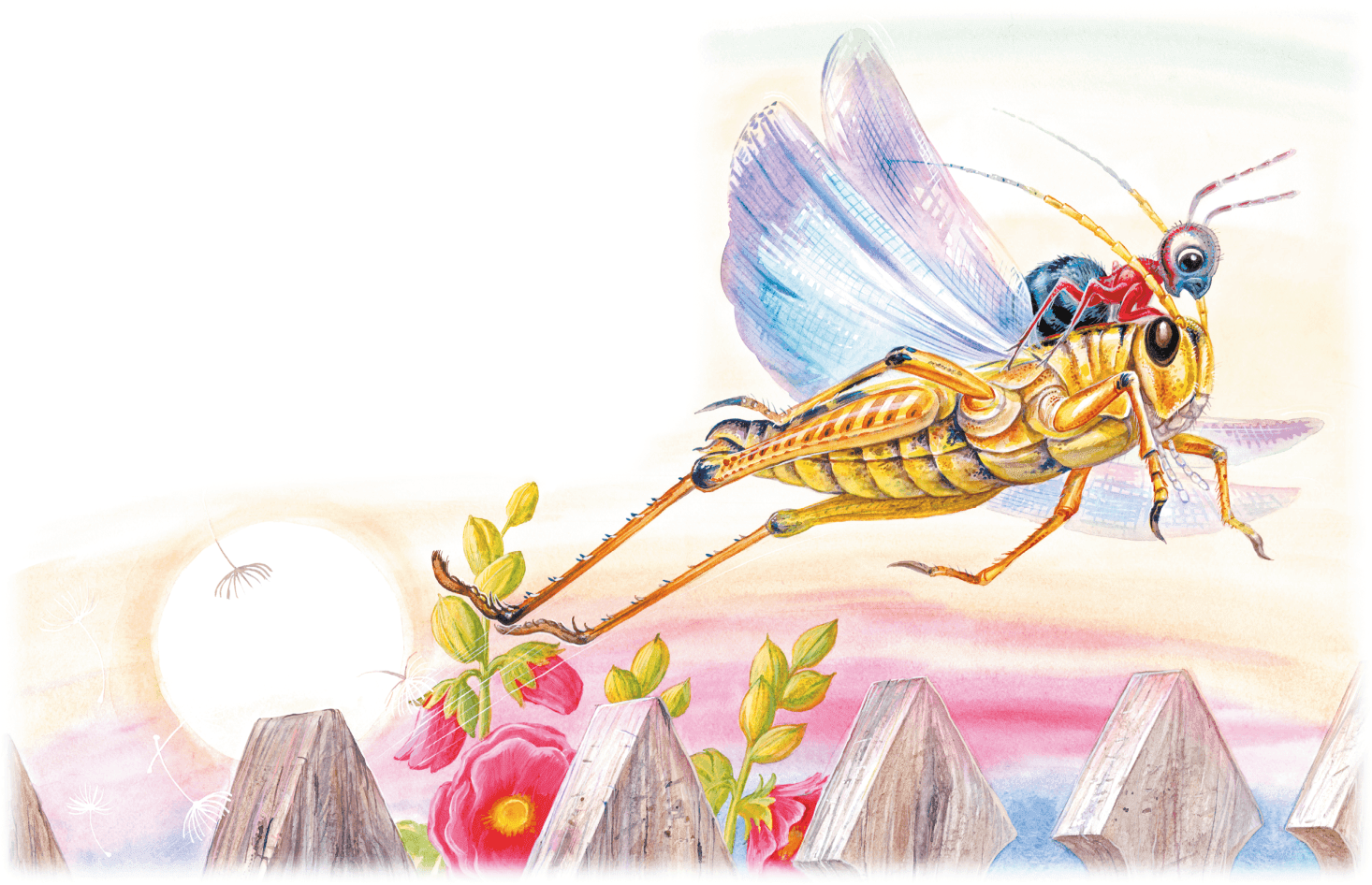 Кузнечик сложил свои длинные задние ноги пополам, потом разом выпрямил их и подскочил высоко в воздух, как Блошачок. Но тут с треском развернулись у него за спиной крылья, перенесли Кузнечика через забор и тихонько опустили на землю.