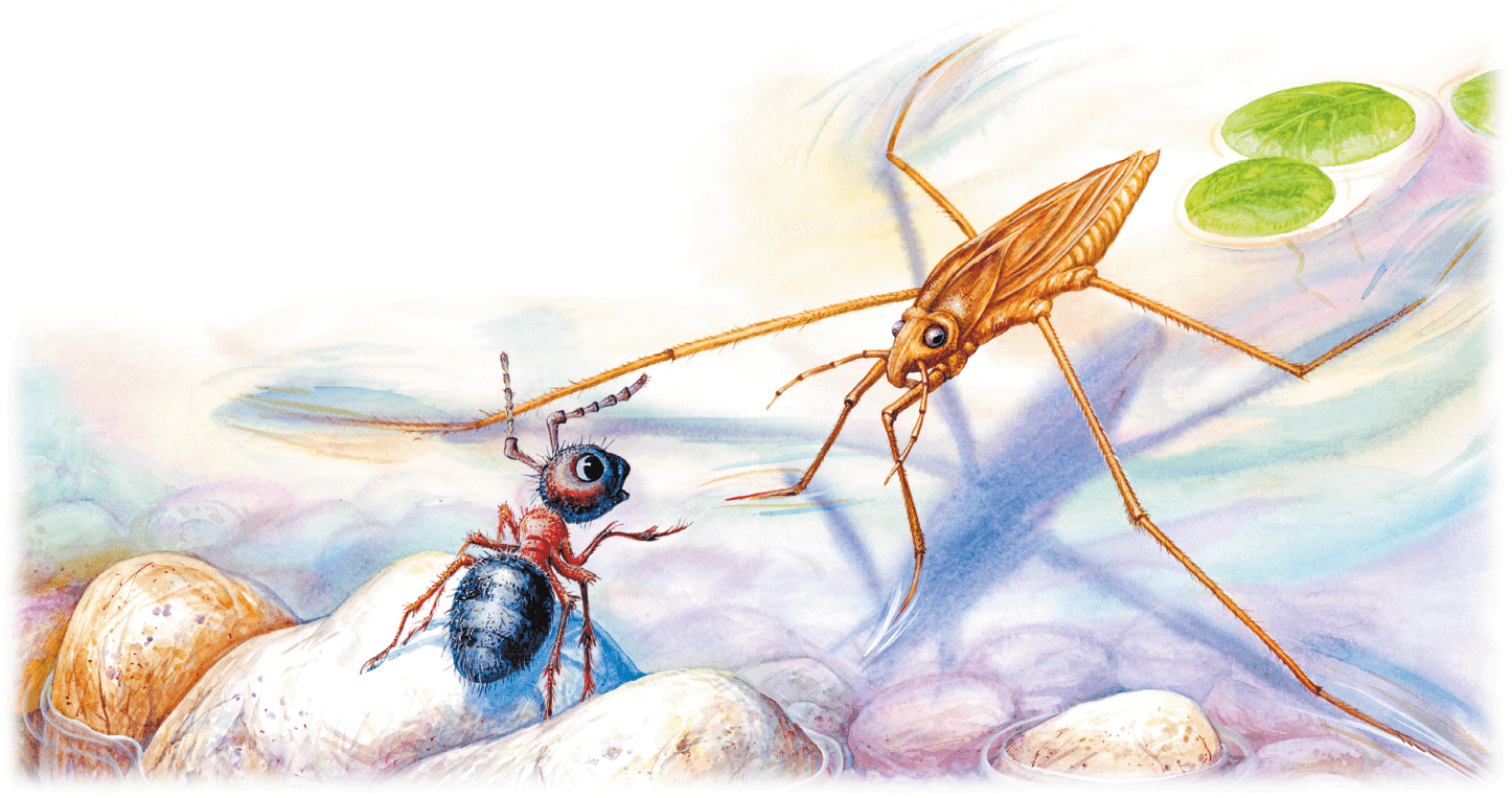 – Через реку и мне не перескочить: очень уж широкая. Стой-ка, я Водомерку кликну: будет тебе перевозчик.