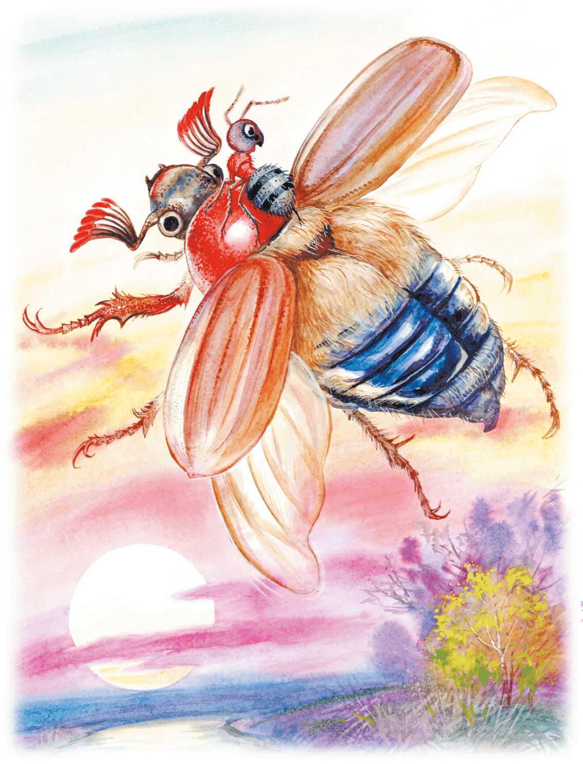 Вдруг затрепетали тонкие крылышки, заработали: «Жжж! Тук-тук-тук!..» Поднялся Хрущ на воздух. Как пробку, выкинуло его ветром вверх – выше леса. Муравьишка сверху видит: солнышко уже краем землю зацепило. Как помчал Хрущ – у Муравьишки даже дух захватило.