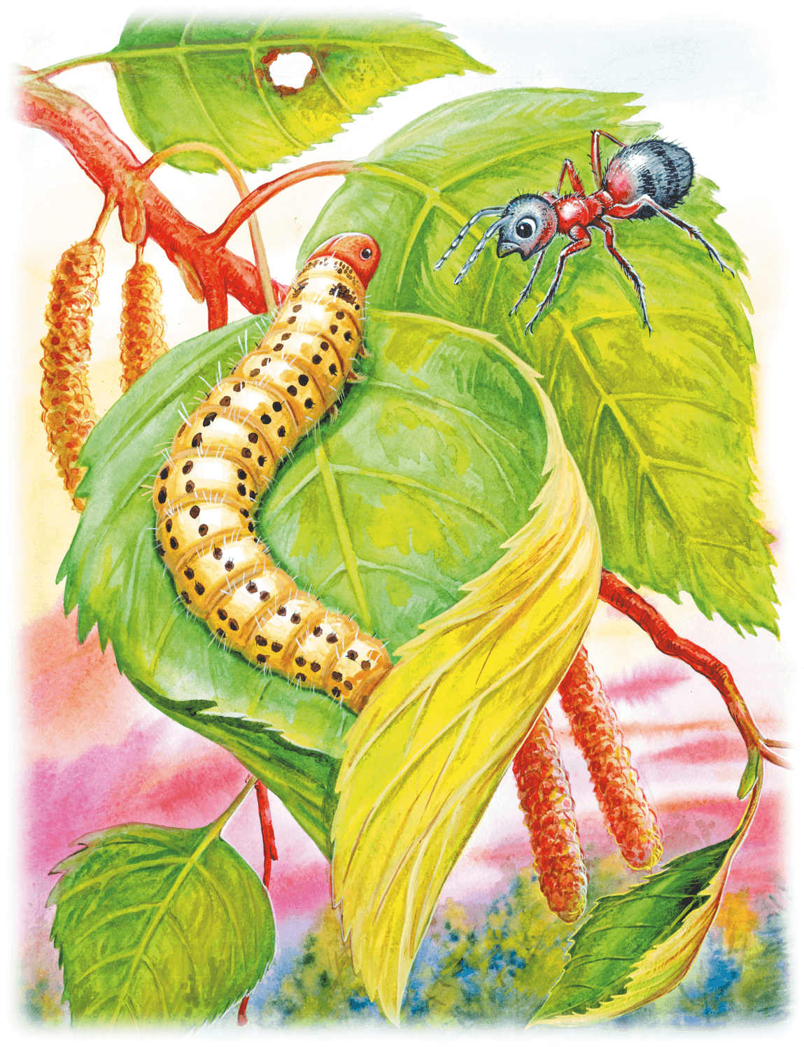 Вдруг видит: рядом на листке Гусеница-Листовёртка сидит, шёлковую нитку из себя тянет, тянет и на сучок мотает.