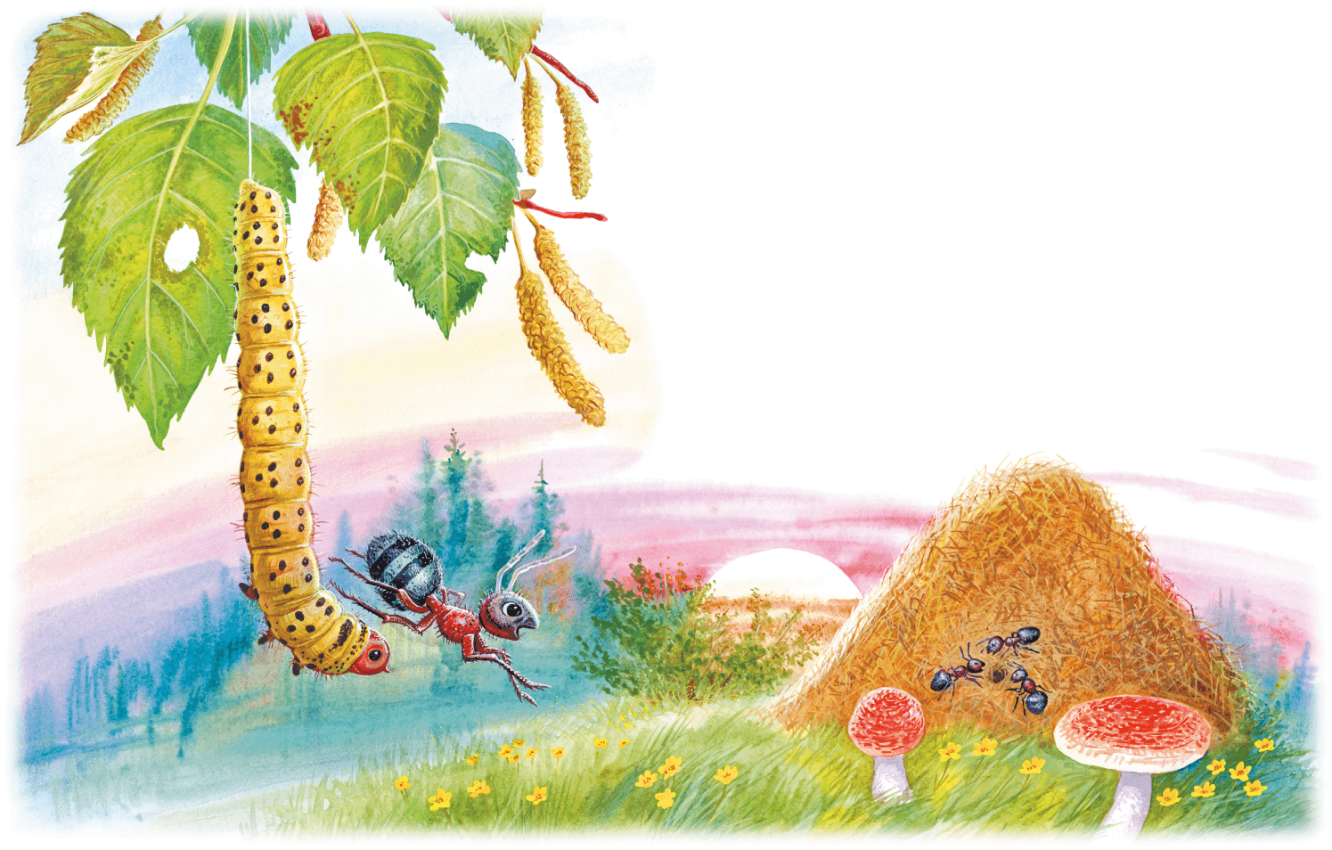 Глянул Муравьишка вниз: а там под самой берёзой его дом родной. Глянул на солнышко: солнышко уже по пояс в землю ушло. Глянул вокруг себя: сучья да листья, листья да сучья. Не попасть Муравьишке домой, хоть вниз головой бросайся!