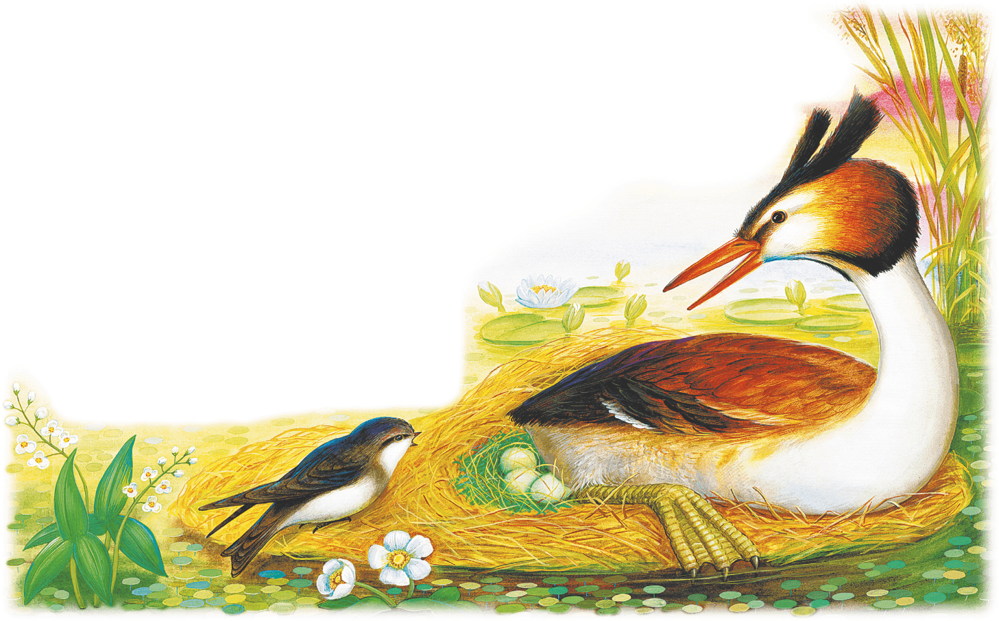 Тут Пеночка с Береговушкой простилась и наказала ей к этой рогатой птице ночевать попроситься. Полетела Береговушка и села на островок. Сидит и удивляется: островок-то, оказывается, плавучий. Плывёт по озеру куча сухого тростника. Посреди кучи – ямка, а дно ямки мягкой болотной травой устлано. На траве лежат Чомгины яйца, прикрытые лёгкими сухими тростиночками. А сама Чомга рогатая сидит на островке с краешка, разъезжает на своём судёнышке по озеру. Береговушка попросилась ночевать.