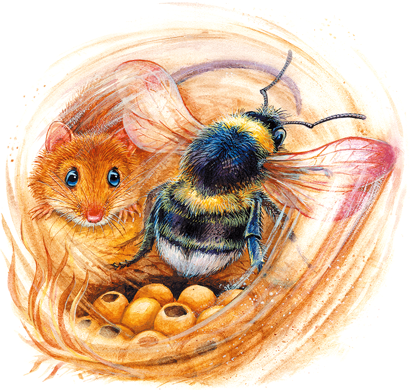 Сделав круг над кочкой, шмель вернулся к своей норке и опустился у её входа. Тут он привстал на лапках и так заработал своими жёсткими крылышками, что ветер пахнул на мышонка.