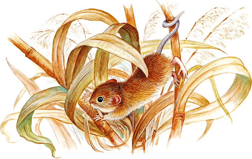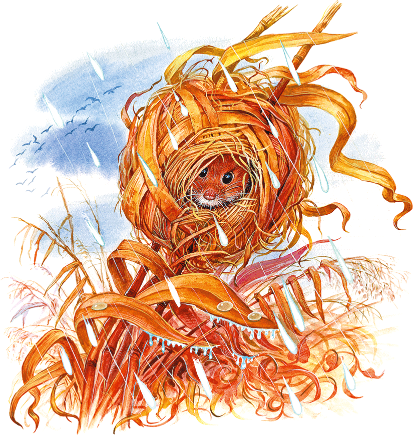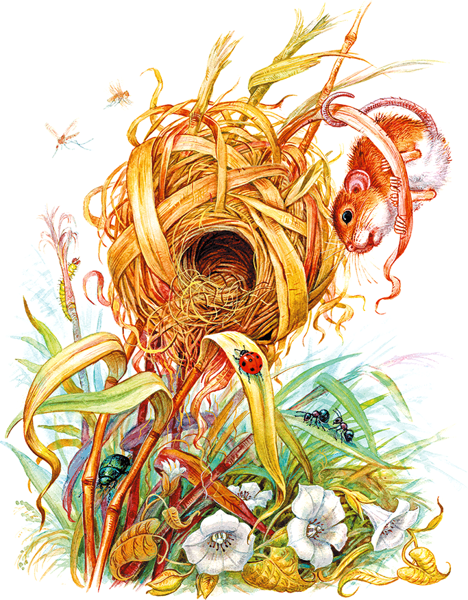 На болотистом лугу рос высокий тростник вперемешку с осокой – отличный материал для мышиной постройки. Пик выбрал несколько растущих рядом тростинок, влез на них, отгрыз верхушки и концы расщепил зубами. Он был так мал и лёгок, что трава легко держала его.