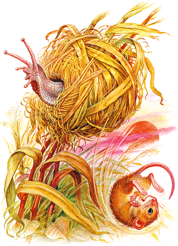 Пик ел. Он перегрызал стебли у самой земли. Стебель падал, и на мышонка летел дождь холодной росы. Зато на конце стебля Пик находил вкусный колосок. Мышонок усаживался, поднимал стебель передними лапками, как руками, и быстро съедал колосок.