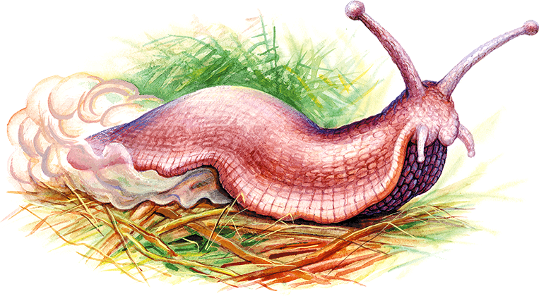 Слизняк начал спускаться на землю. Его мягкое брюхо плотно прилипало к стеблю, и на стебле оставалась широкая полоса густой слизи.