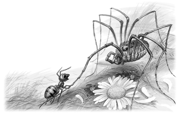 Пришлось Муравьишке по паучьей ноге вверх лезть до коленки, а с коленки вниз спускаться Пауку на спину: коленки у Сенокосца торчат выше спины.