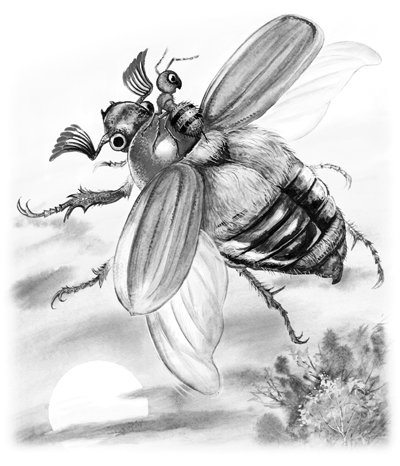 Влез Муравьишка Жуку на голову. И хорошо, что не остался на спине: разломил Жук спину надвое, два жёстких крыла приподнял. Крылья у Жука точно два перевёрнутых корыта, а из-под них другие крылышки лёзут, разворачиваются: тоненькие, прозрачные, шире и длиннее верхних.