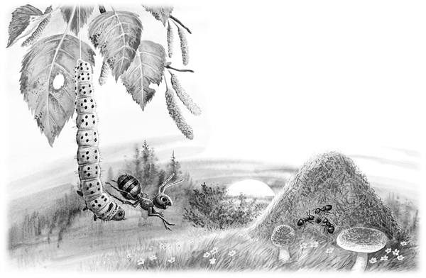 Муравьишка вскарабкался на спину к Землемеру. Тот изогнулся дугой, задние ноги к передним приставил, хвост – к голове. Потом вдруг встал во весь рост, да так и лёг на землю палкой. Отмерил на земле, сколько в нём росту, и опять в дугу скрючился. Так и пошёл, так и пошёл землю мерить. Муравьишка то к земле летит, то к небу, то вниз головой, то вверх.