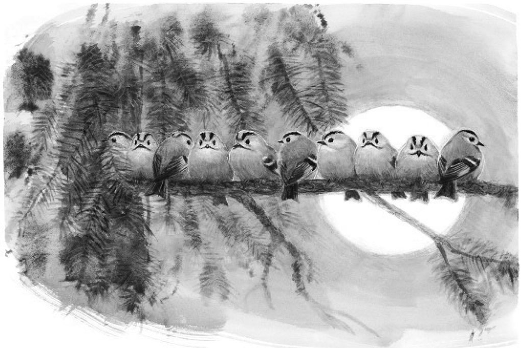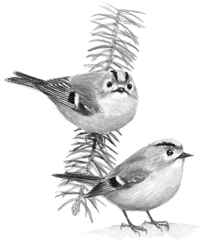 Там, на ветке у самого ствола, спали, тесно прижавшись друг к другу, корольки.