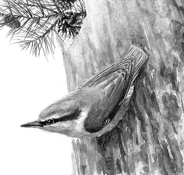 Поползень один во всём лесу умел бегать по стволу головой вниз. Он водил за собой всю команду, когда дятел отлучался по своим делам.