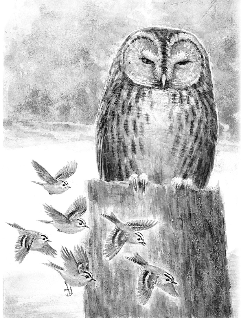 Дятел сел на дерево и громко забарабанил и закричал. Поползень и пищухи сновали по ветвям и пронзительно посвистывали. А смелые синицы прямо ринулись в бой и с писком и свистом стали кидаться на сову, чуть не задевая её своими короткими крылышками. Расхраб-рившиеся корольки сейчас же присоединились к ним.