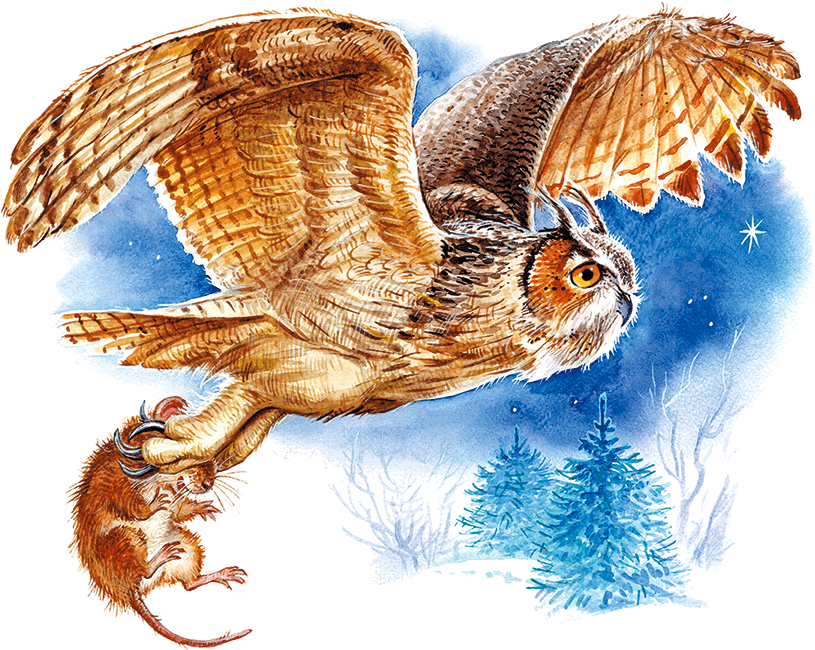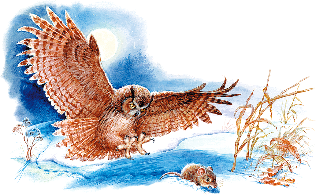 Дело же было так. На льду реки его настигла ушастая лесная сова! Она стукнула его клювом по голове, схватила когтями и понесла в лес.