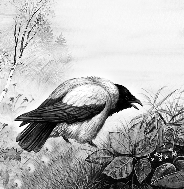 Анютка выскочила из-под куста, глядь: Белое Зеркальце в лес улетает, а ворона мёртвая на воде лежит.