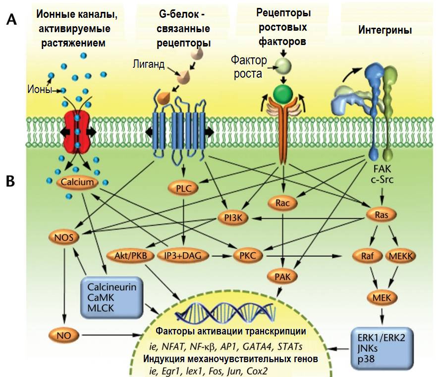 Для «считывания» сигналов в липидных слоях клеточных мембран располагаются различные типы механочувствительных рецепторов: ионные каналы, активируемые растяжением; интегрины; рецепторы факторов роста и рецепторы, связанные с G-белком.