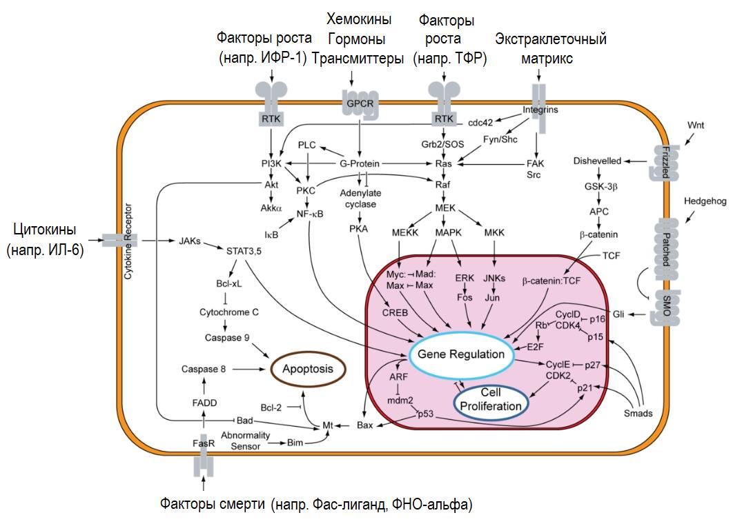 Таким образом, дифференцировка, рост, жизненный цикл и гибель клеток регулируются и всецело зависят от внешних стимулов и внутриклеточных сигнальных каскадов, влияющих на генетическую регуляцию.