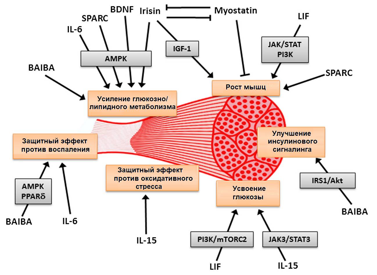 Основные миокины, их сигнальные пути и эффекты воздействия (Huh, 2018).
