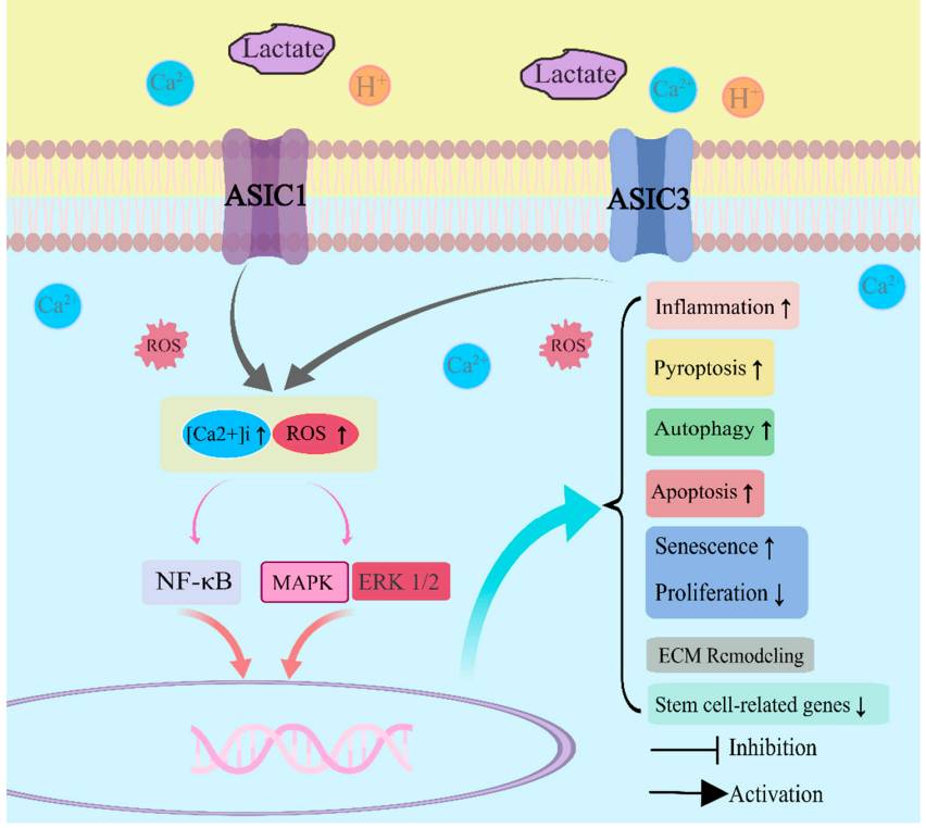 Гиперактивация кислотночувствительных каналов вызывает воспаление, увеличивает пироптоз, апоптоз, повышает аутофагию, ускоряет старение клеток, снижает их пролиферацию, влияет на ремоделирование матрикса, подавляет транскрипцию генов стволовых клеток (Luo et al., 2023).