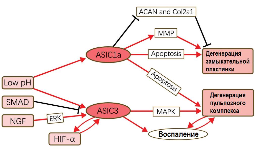 Эта же судьба и хондроцитов замыкательной пластинки. ASIC3 работает в паре с фактором, индуцируемым гипоксией-1α (HIF-1α), и регулирует адаптационные возможности клеток к гиперосмотической среде в условиях умеренного ацидоза. Выраженное скисание диска приводит к компенсаторному увеличению количества рецепторов ASIC3 на мембране, что увеличивает количество входящего Ca2+. Дальше дегенерация развивается по двум сценариям: